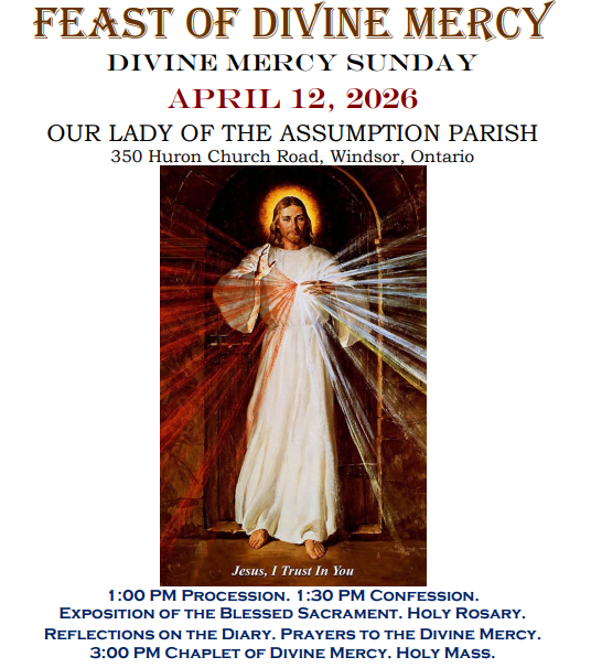 Categories: Events Event: Feast of Divine Mercy Date: April 12th, 2026 Time: 1:00pm Location: Assumption Church
